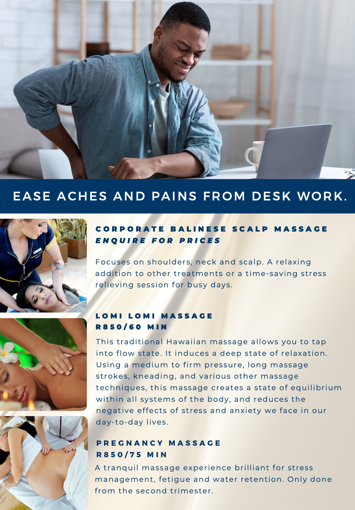 MASSAGE THERAPY BOOK A MASSAGE ! Jukskei Park Branch Randburg Branch We Travel To You Download our massage ebook for great pre and post-massage advice.We got your back. DOWNLOAD THE E-BOOK NOW