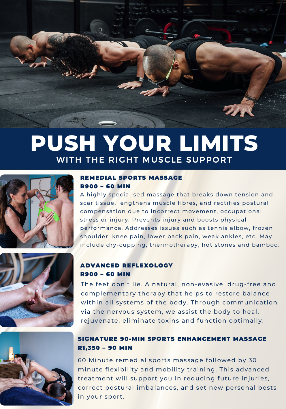 We cover all necessary aspects such as personal and group training, joint mobility and flexibility, nutrition, correct earth grown nutrients supplementation, as well as remedial sports massage to boost performance and prevent injury.